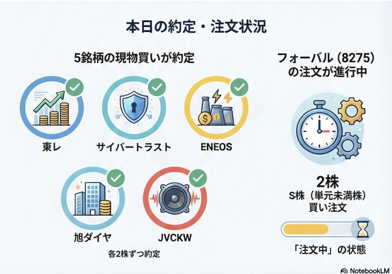 現在、さらに**フォーバル(8275)を2株、成行で注文中(未約定)**です。これが約定すれば、保有銘柄は9銘柄となります。