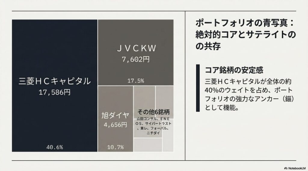当ポートフォリオは、資金の約40%を連続増配の優良株である「三菱HCキャピタル(12株)」に集中させています。これが、ポートフォリオ全体を支える強力なアンカー(錨=コア銘柄)として機能しています。