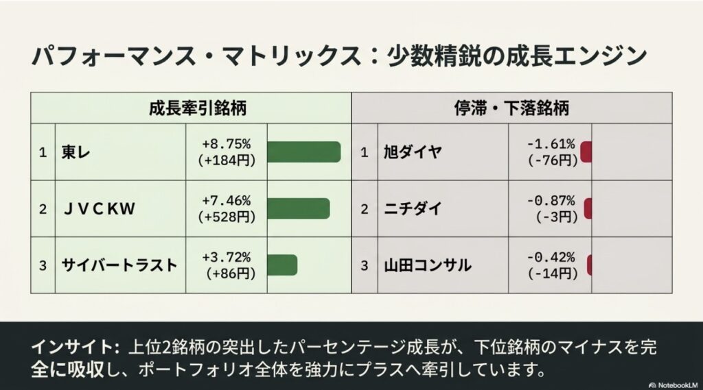 ここで重要なのは、「一部の銘柄がマイナスになっても、上位銘柄の突出した成長がそれを完全に吸収し、ポートフォリオ全体を強引にプラスへ引っ張り上げている」という事実です。