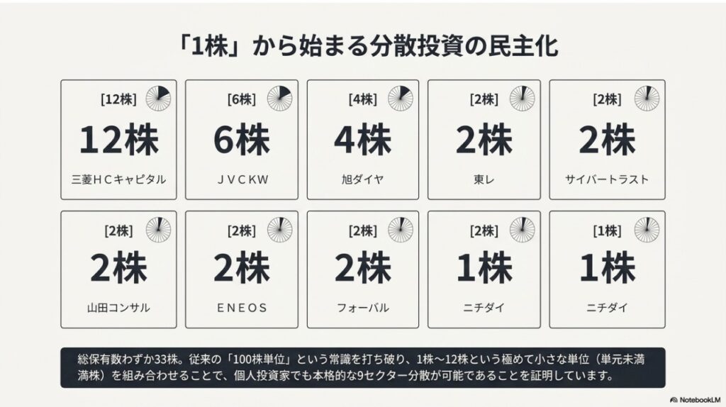 総保有数はわずか33株。従来の「100株単位で買わなければならない」という常識を打ち破り、1株〜12株という極めて小さな単位(単元未満株)を組み合わせることで、個人投資家でもプロ顔負けの「9セクター分散」が可能であることを証明しています。