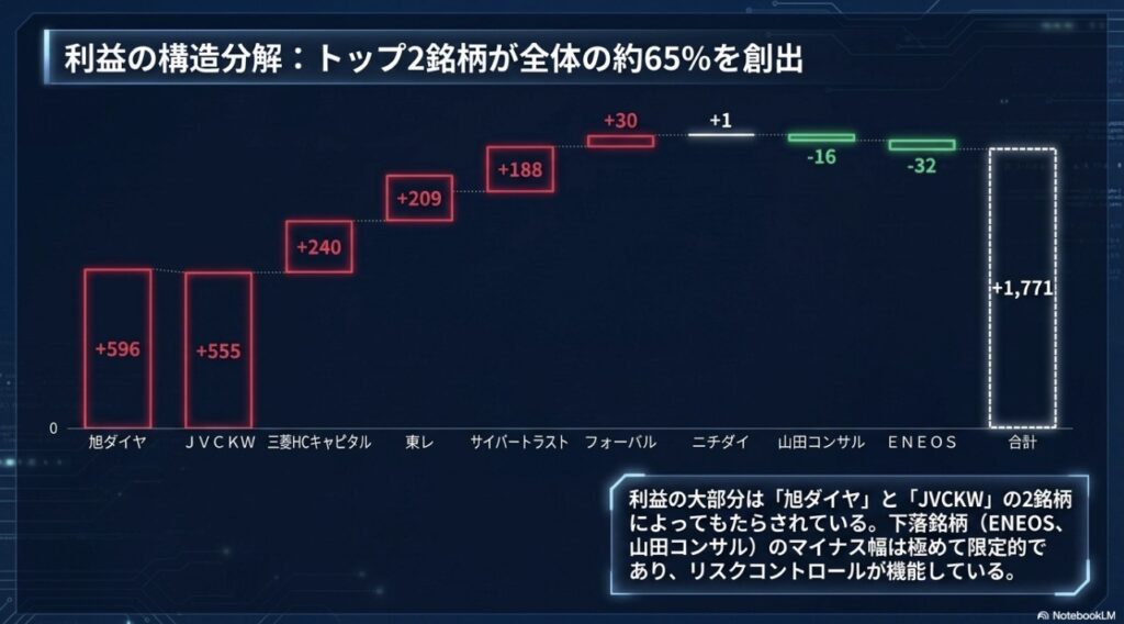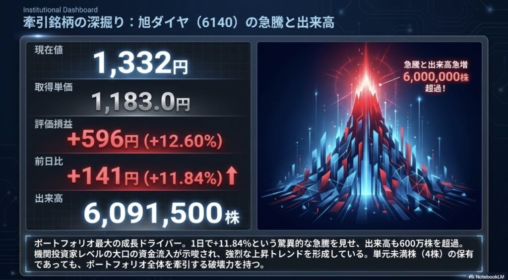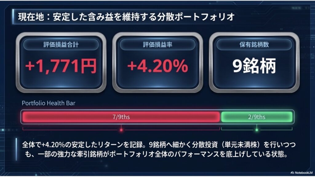 主力が崩れた日には、サテライトの旭ダイヤやサイバートラストが火を噴き、下落を完全に吸収した上で全体を上へ押し上げる。これこそが、セクターを散らした「9銘柄・マイクロ分散投資」の真骨頂であり、最大のメリットです。